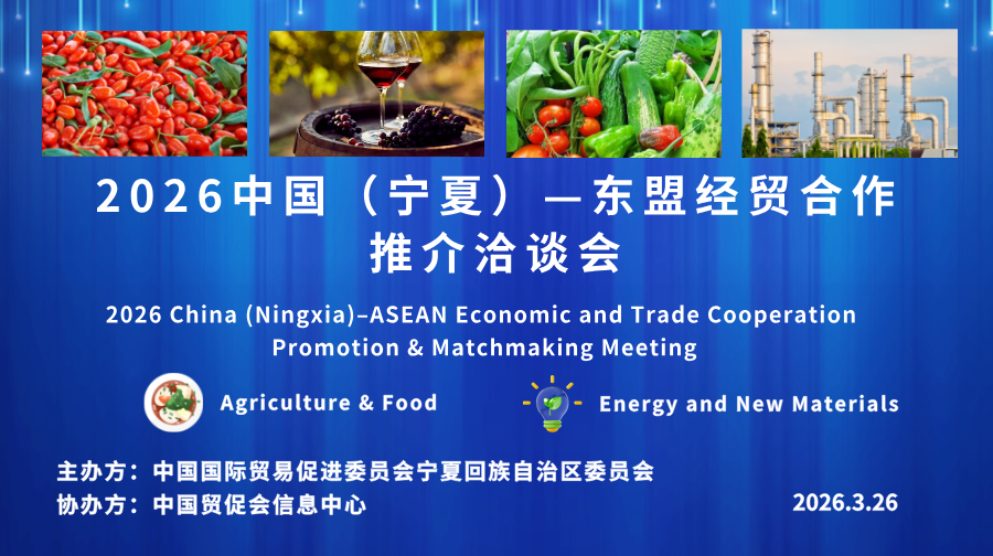 为进一步深化中国与东盟国家在农产品及食品加工、化工及新材料、新能源与设备制造等领域的经贸合作,中国国际贸易促进委员会宁夏回族自治区委员会与中国贸促会信息中心将于2026年3月26日举办线上 “ 2026中国—东盟经贸合作推介洽谈会”。