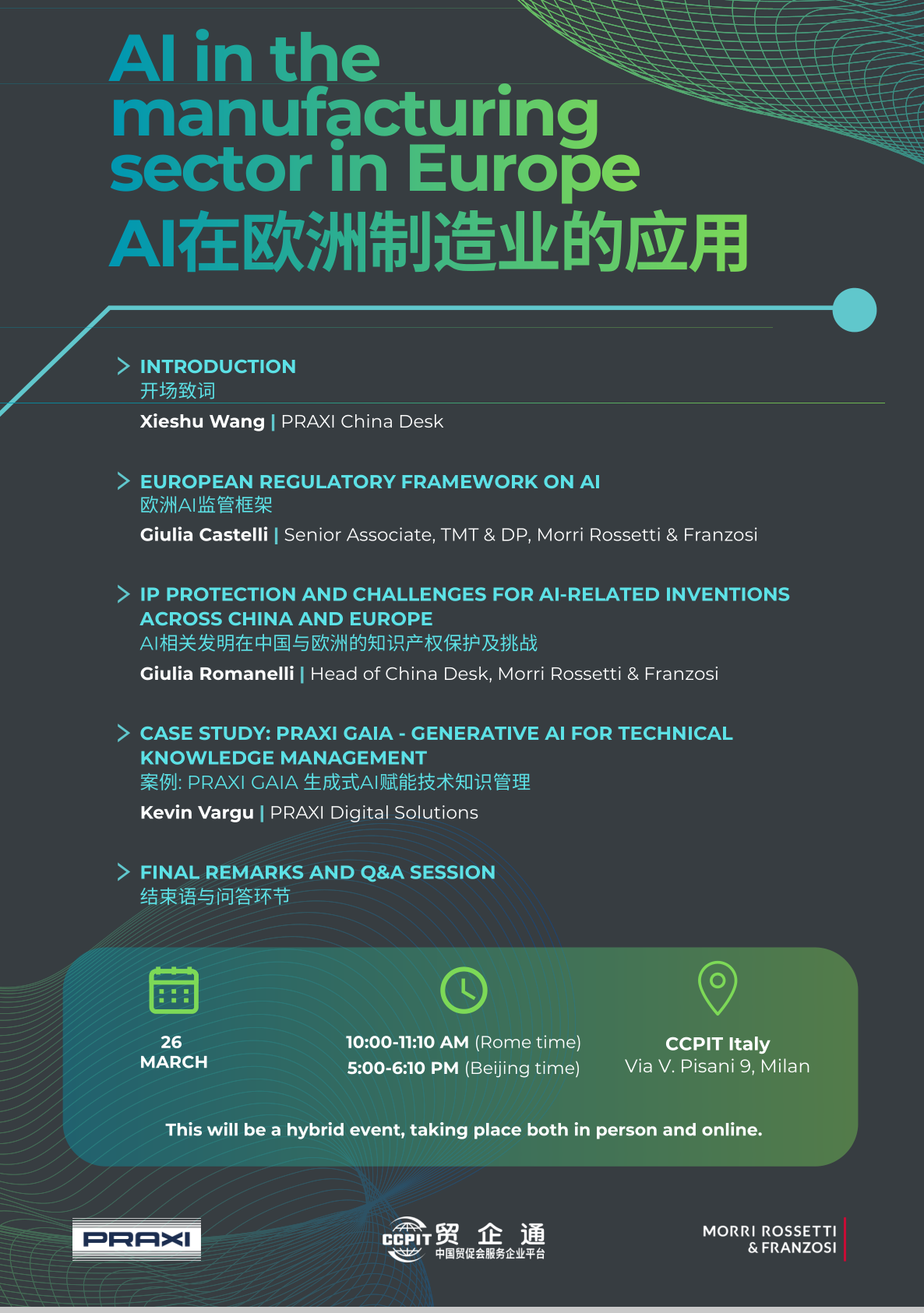 This lecture invites the heads of the China practice of the Italian consulting firm PRAXI and the law firm Morri Rossetti & Franzosi to interpret the EU AI Act and its regulatory framework in Italy. The lecture will analyze the intellectual property protection and challenges of AI-related inventions in China and Europe, and will use concrete cases to explain the application scenarios of the laws in a clear and concise manner.