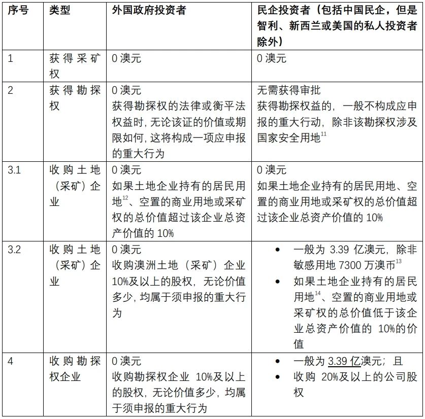若中国投资者获取采矿权,该行为属于应申报的重大行为,无论投资金额的大小均需要事先获得FIRB审批。[3]