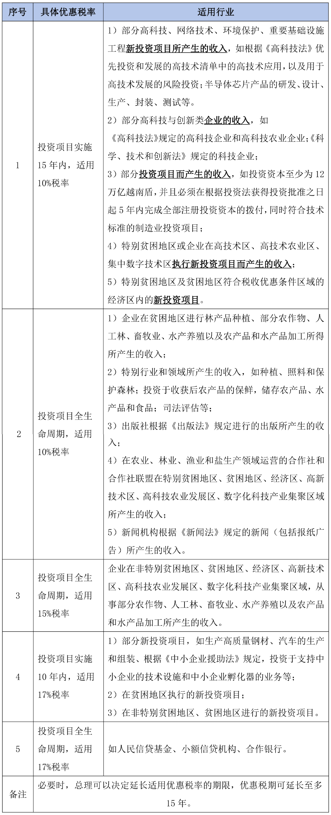 (2)位于贫困地区的部分特殊行业的投资项目全生命周期享受企业所得税10%的优惠税率。位于贫困地区的新的投资项目可享受10年享受17%优惠税率,适用“二免四减半”政策。位于贫困地区参与教育、培训、职业培训、医疗保健、文化、体育和环境、司法评估领域和行业的投资项目可享受“四免九减半”的政策,否则适用“四免五减半”。