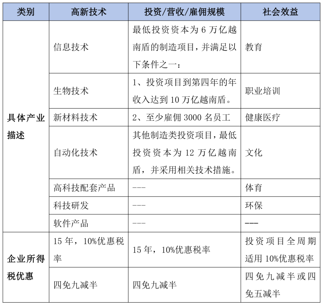 关于越南企业所得税减免的投资优惠具体内容主要载于《Law on Corporate Income Tax》(《企业所得税法》)及相关法令和规章。越南于2025年6月14日颁布新的No.67/2025/QH15号《企业所得税法》,该法将于2025年10月1日生效。