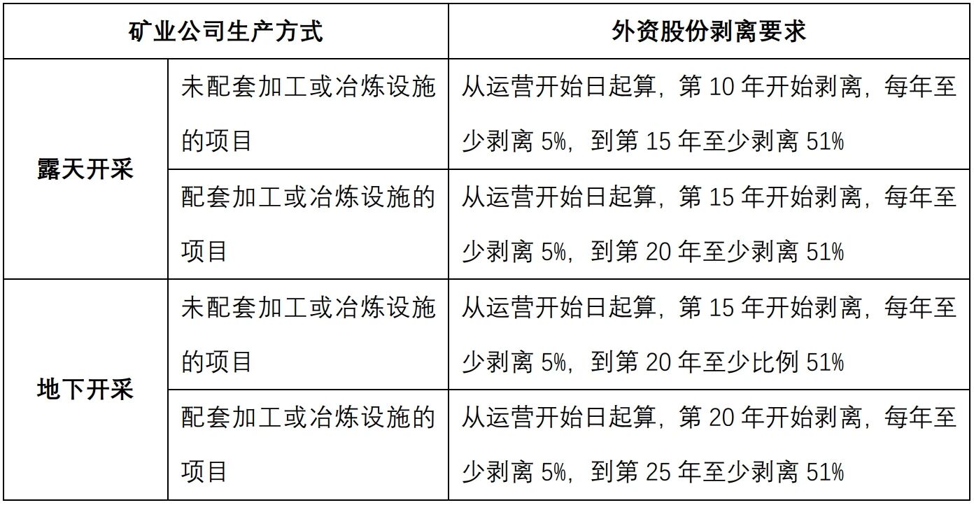 印尼对外资在采矿权的持有上有严格限制。外国实体不能直接拥有勘探权或采矿权,必须通过设立印尼境内的外商投资公司来参与。《2009年矿业法》已经要求外商投资矿业公司在一定商业生产期后,逐步将其51%的股份出售给印尼一方(即中央政府、地方政府、国有企业、地方企业或印尼当地公司),[5]《矿业法2020年修正案》以及相应的实施细则对于外资剥离要求更加全面[6],根据不同的采矿及生产加工方式而有所不同,相关要求可见下表: