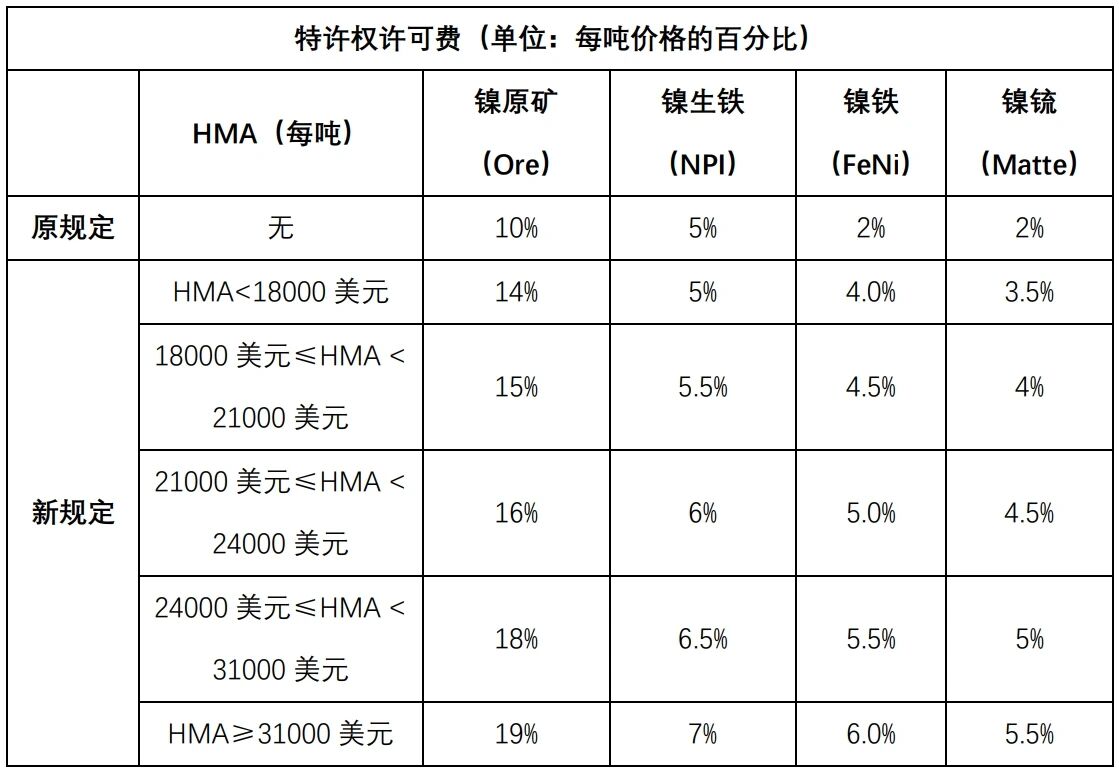 值得注意的是,此次费率调整主要针对镍原矿及初级加工产品,如镍生铁、镍铁和镍锍。与此同时,此前长期费率豁免的硫酸镍(nickel sulfate)、一级镍(Class I nickel)等也被纳入了缴纳范围,但其适用费率保持在1.5%或2.0%的固定低水平,以鼓励下游深加工产业的发展。