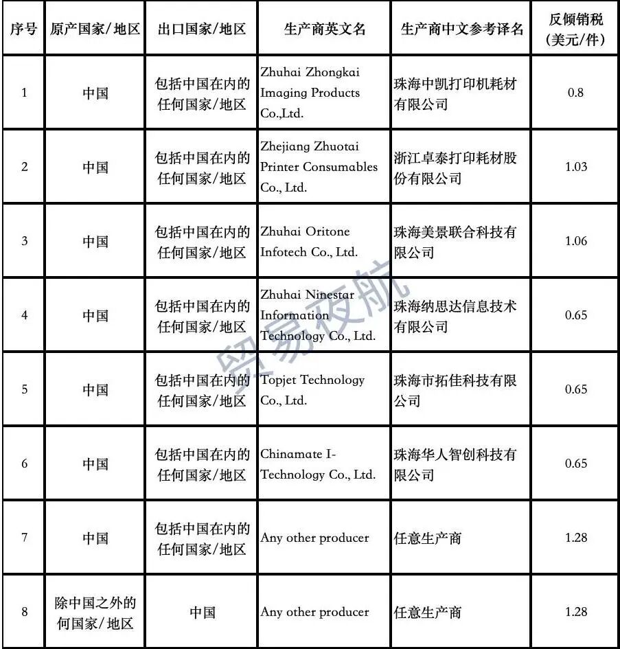 9月26日,印度商工部发布公告,对原产于或进口自中国的黑色硒鼓(Black Toner Powder Cartridge)作出反倾销肯定性终裁,建议对中国的涉案产品征收为期 5 年的反倾销税,税额为0.65-1.28美元/件,征税详情见附表。