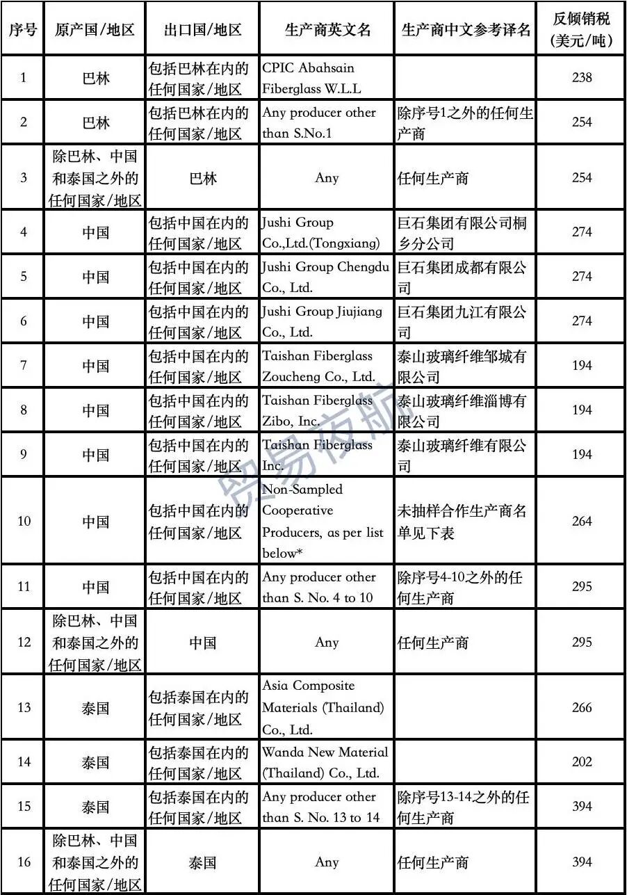 9月8日,印度商工部发布公告,对原产于或进口自中国、巴林和泰国的玻璃纤维及其制品(Glass Fibre and articles thereof)作出反倾销肯定性终裁,建议对上述国家的涉案产品征收为期5年的反倾销税,分别如下:中国为194-295美元/吨,巴林为238-254美元/吨,泰国为202-394美元/吨,征税详情见附表。