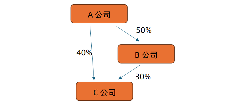 (3)单独持有:上述第(1)项情形为单独直接持有,此外还存在如下单独间接持有的情形,即A公司为50%规则清单主体,持有未列名主体C公司40%股权和B公司50%股权,同时B公司持有C公司30%股权,则C公司将被视为50%规则清单主体受相关限制: