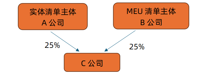 ii. 如A公司为实体清单主体,B公司为MEU清单主体,且均各自持有C公司25%股份,则C公司将视为清单主体受到有关限制,具体所受的限制要求将在下文详述:
