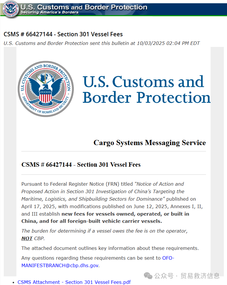 根据2025年4月17日发布的联邦公报通知(FRN)《关于中国针对海事、物流和造船行业主导地位的301条款调查的行动及拟议行动通知》,以及2025年6月12日发布的修订内容,附件I、II和III为中国拥有、运营或建造的船舶,以及所有外国建造的车辆运输船设立了新的费用。