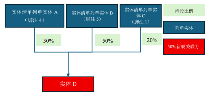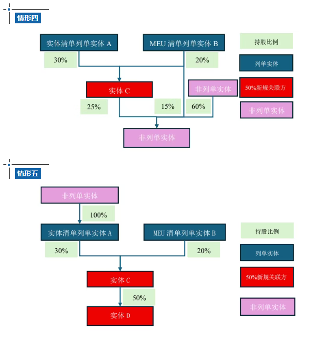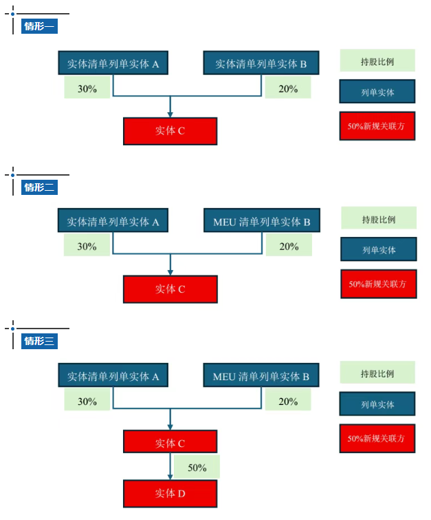 根据BIS的规定,被列单实体(包括下述提及的实体清单、MEU清单和特定SDN列单实体)直接或间接,单独或合计持有50%或以上的股权的关联方将被自动视为列单实体。此外,结合BIS FAQ 43的答复,BIS 50%规则与OFAC一致,采取的是“所有权”(ownership)标准,并非“控制”(control)。具体实例如下: