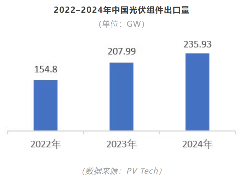 数据显示[1],2024年中国光伏组件出口达到 235.93GW,同比增长13%,出口数量为8.2亿个,同比增长约80%。