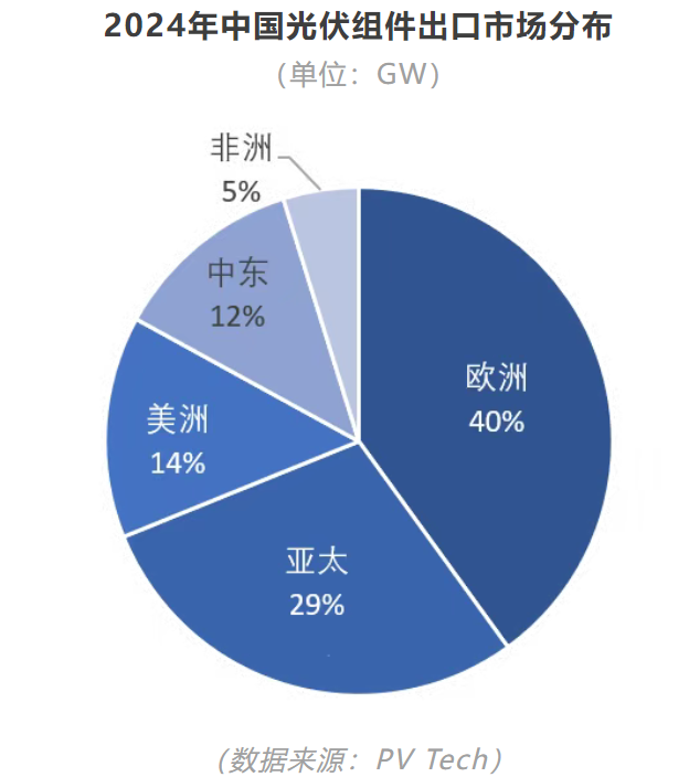 在全球光伏市场多元化的趋势下,我国光伏产品出口态势持续向好,其中2024年我国出口的光伏组件中,约有47% 流向全球南方国家,首次与发达国家进口规模相持平。