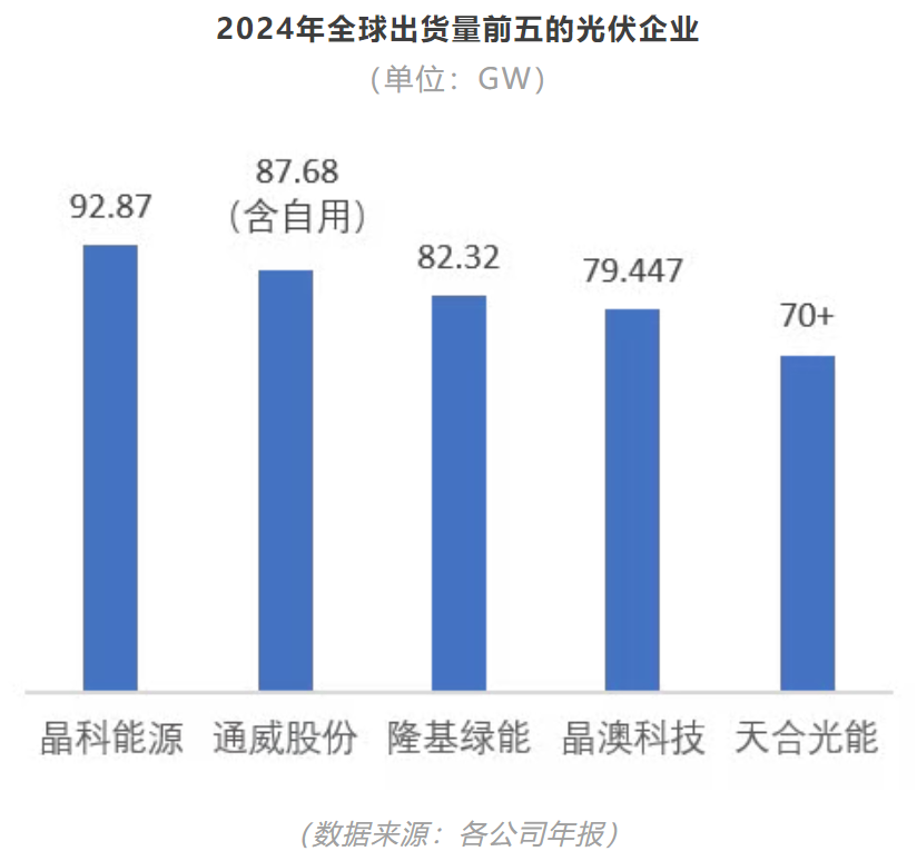2024年晶科能源、晶澳科技、隆基绿能与天合光能连续稳居出货量前四名,在前十总量中占比高达63%。自2019年起,这几家垂直整合的头部公司基本维持在前四格局,“强者恒强”趋势明显。