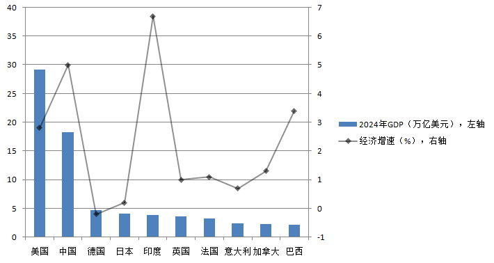 图1 世界前十大经济体GDP总量和增速