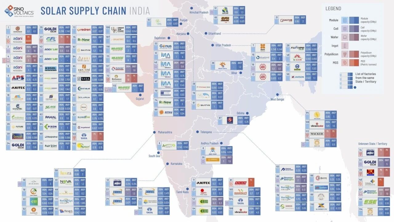 2024年中国向印度出口光伏产品(含组件、电池 、逆变器等)超过200亿元。根据新伏科技(Sinovoltaics)定期发布的《印度太阳能供应链地图》,2025年7月印度光伏组件总产能已达68.4吉瓦,太阳能电池产能为24.5吉瓦,硅锭产能为14吉瓦。