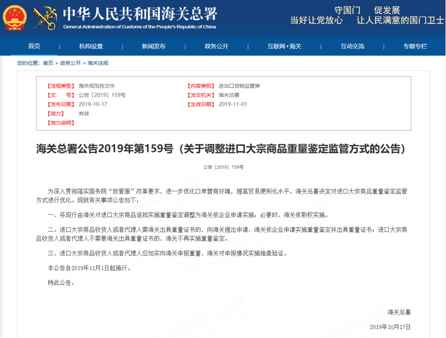 自公告实施之日起,进口大宗商品收货人或其代理人需要海关出具重量证书的,收货人或其代理人向海关申报时,应选择一次性完整申报模式,通过勾选“需要重量证书”的方式向海关提出申请,海关依企业申请实施重量鉴定。