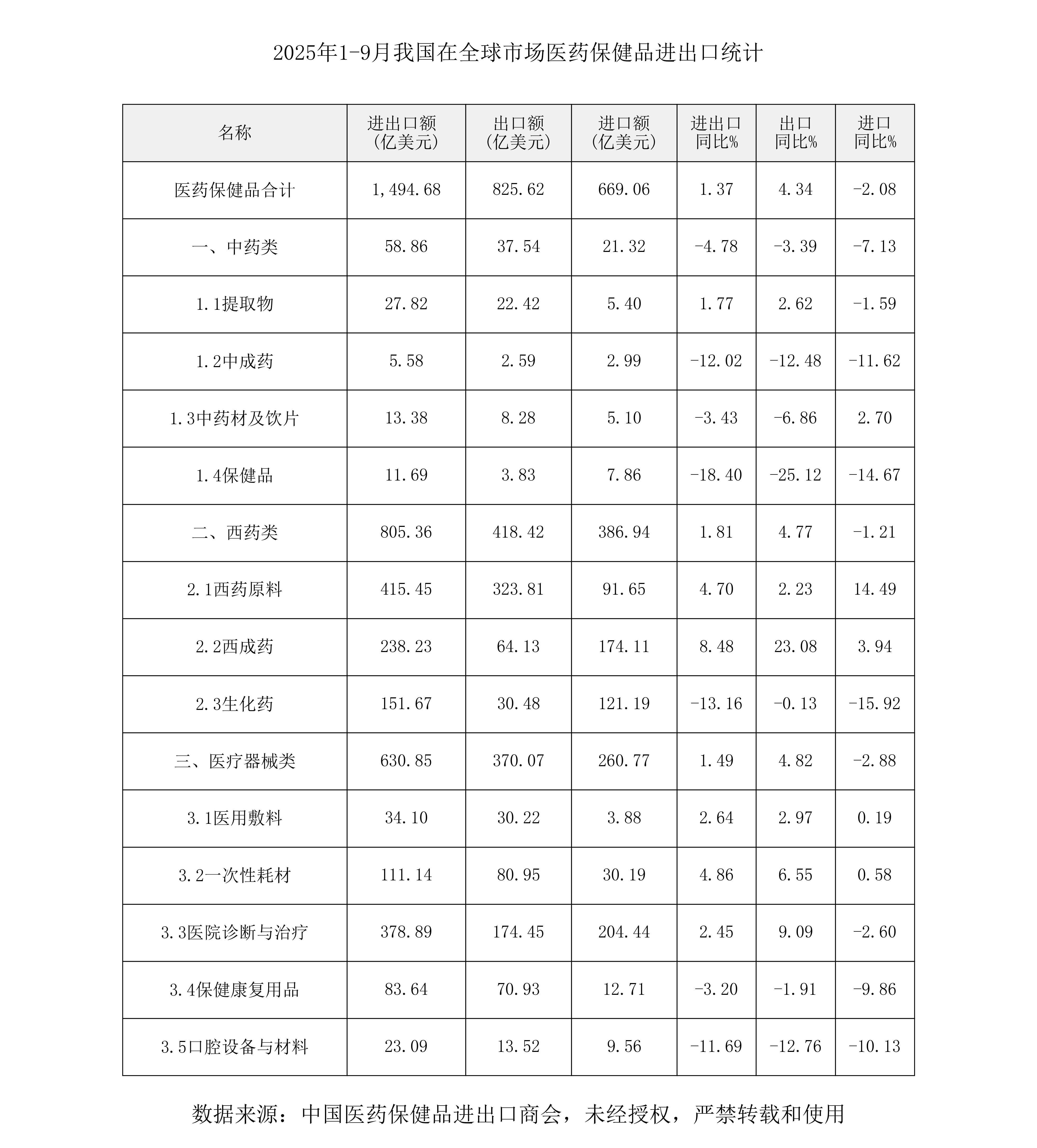 总之,2025年前三季度,中国医药保健品进出口在复杂环境中实现了量和质的双重提升,出口结构优化与市场多元化成为核心特征。未来,随着产业升级与全球化布局深化,中国医药外贸有望在稳健增长中实现更高质量的发展。