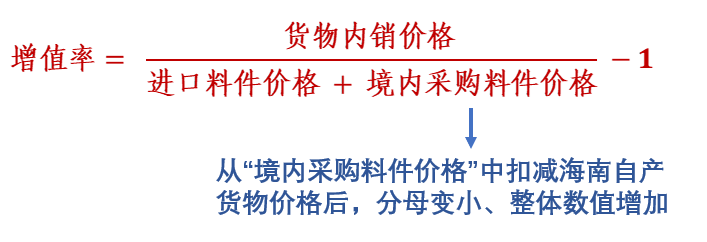 海南自产货物纳入加工增值的计算范围,这是对封关后政策的重要优化。海南自产货物在加工增值免关税政策适用中的核心作用是,使制成品的增值率大大提高。在内销价格没有变化的前提下,增值计算公式中的分母变小、分子增大,实现30%增值的门槛大大降低。这种设置更有利于促使企业从采购原料开始即在海南自贸港内布局供应链。