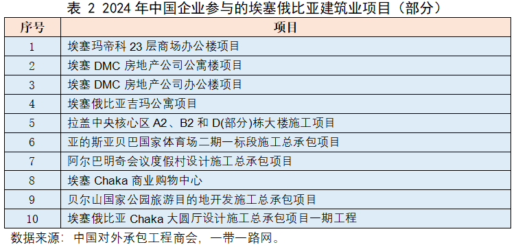 3、中企深度布局房建市场,项目金额体量居前。中国企业深度参与埃塞俄比亚房建领域,涵盖住宅、公寓、商业综合体、办公楼、教育科研设施、会展中心、体育场馆、酒店度假村及景观工程等多类型项目,体现出布局广、金额大和多元化的特点。从金额上看,既有合同额达3亿美元的旗舰工程,如DMC房地产公寓楼(2.99亿美元)、玛帝科23层商场办公楼(3.22亿美元),也有智慧路灯、科研实验楼等中小型项目,显示出中企在市场中的适配能力与分层布局优势。从实施进度看,多个项目已形成较高营业额,如亚的斯亚贝巴会展中心已完成1.55亿美元,Chaka大圆厅一期完成2417万美元,整体推进顺利。总体而言,中企在该领域以高端住宅、公建综合体为核心,辅以特色项目支撑城市功能升级,助力改善城市面貌。