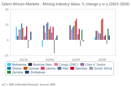 但是,非洲部分国家因主导矿产品种价格低迷面临发展瓶颈:纳米比亚受铀价低迷影响,矿业板块发展空间受限;博茨瓦纳由于毛坯钻石需求疲软,增长潜力不足;锂价承压将导致津巴布韦矿业陷入增长停滞。