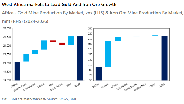 2026年非洲矿业的增长,在很大程度上得益于黄金价格持续处于高位。尽管黄金均价预计将从2025年的3250美元/盎司小幅回落至3200美元/盎司,但该价位仍足以推动主要产金国释放产能并吸引资本流入。西非国家将成为最大受益者,加纳、布基纳法索和科特迪瓦的黄金产量预计分别实现7%、12%和4%的同比增长,大量资本正流向这些国家的在产项目、开发中资产及新勘探项目。