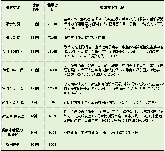 海关的行政处罚明显遵循“过罚相当”原则,并充分体现了对当事人事后积极补救行为的鼓励。从统计可以看出来,“不予处罚”和“30%以下” 这两类(共占40%)的案例,绝大多数都存在“认错认罚 + 主动消除危害后果(退运/补证)”的情形。这表明企业事后的积极配合和补救措施是减轻处罚的关键因素。
