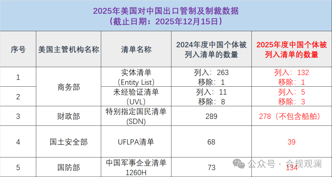 截至2025年12月23日,实体清单(Entity List)与UFLPA清单的新增实体数量为去年同期的一半;特别指定国民清单(SDN清单)新增中国实体数量与去年同期持平;但中国军事企业清单(CMC或1260H清单)列名数量明显增加。