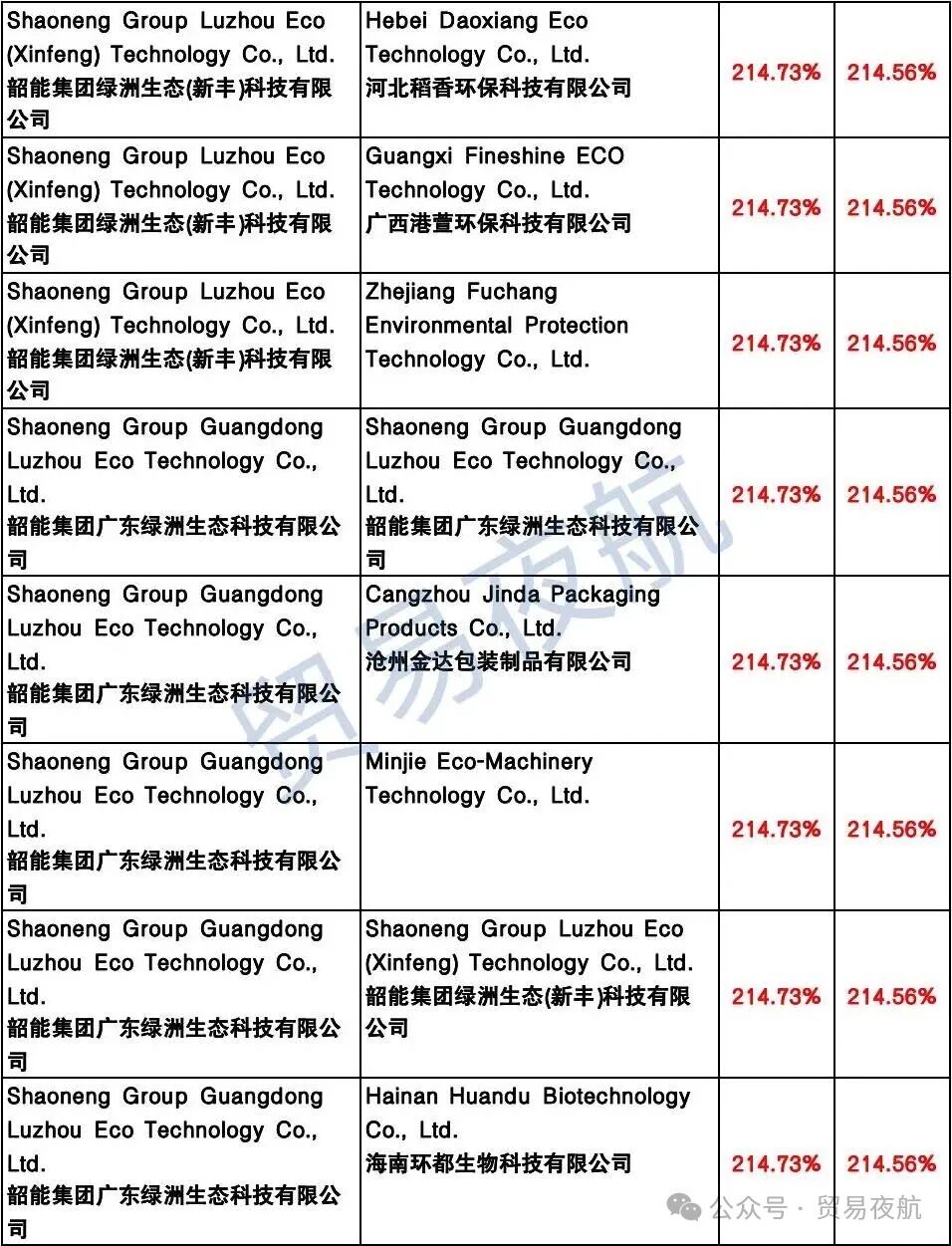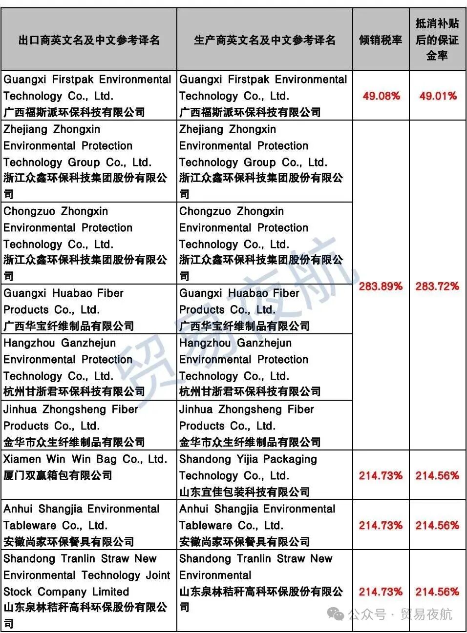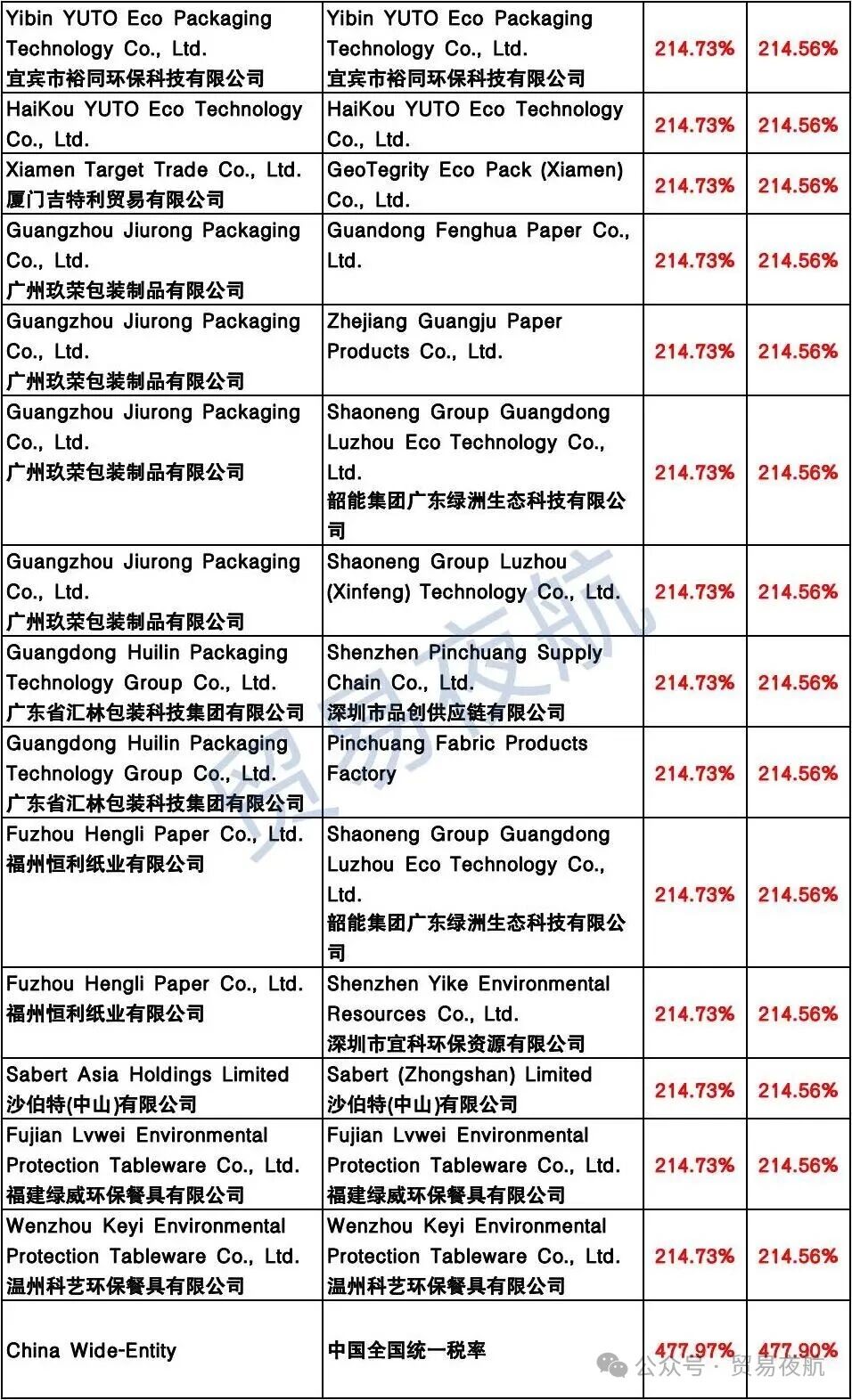 附表:美国对中国企业反补贴税率表