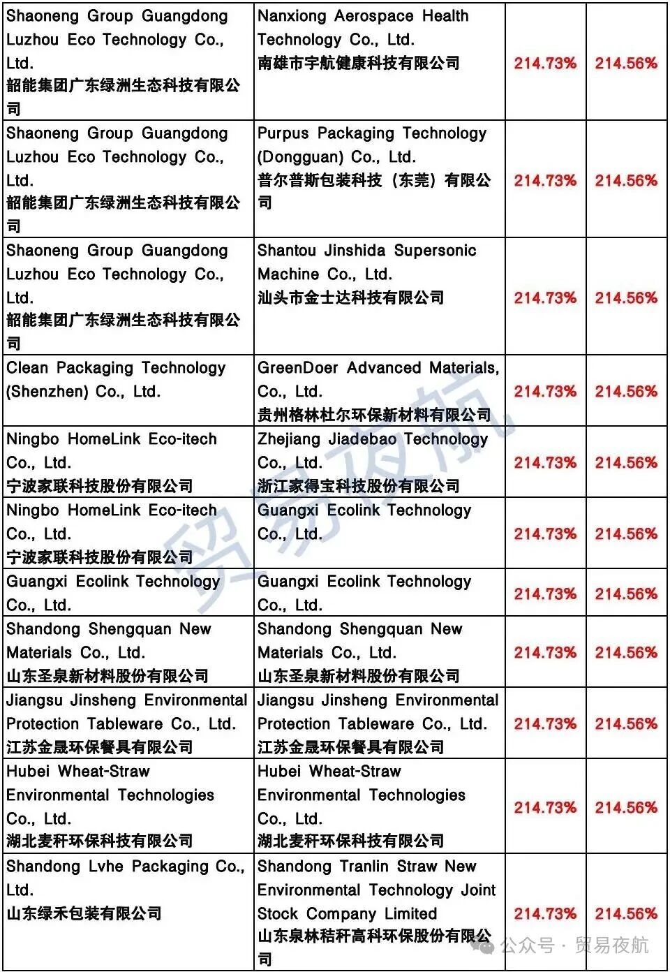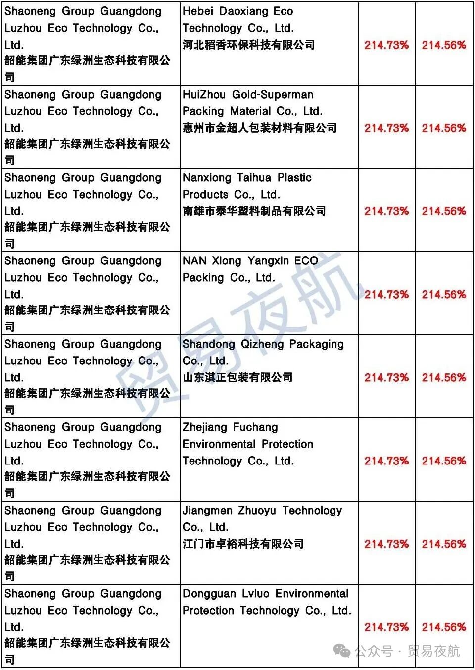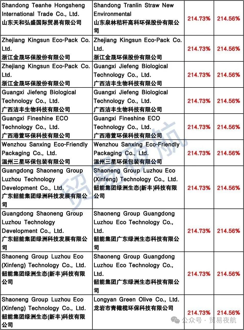 附表:美国对中国企业反补贴税率表