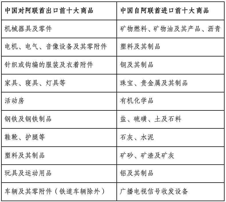 双边贸易领域,中国已多年保持阿联酋第一大贸易伙伴地位。2023年,两国非石油贸易额近810亿美元,同比增长4.2%[4]。根据中国海关统计,近年来,中阿双边进出口商品主要类别包括[5]: