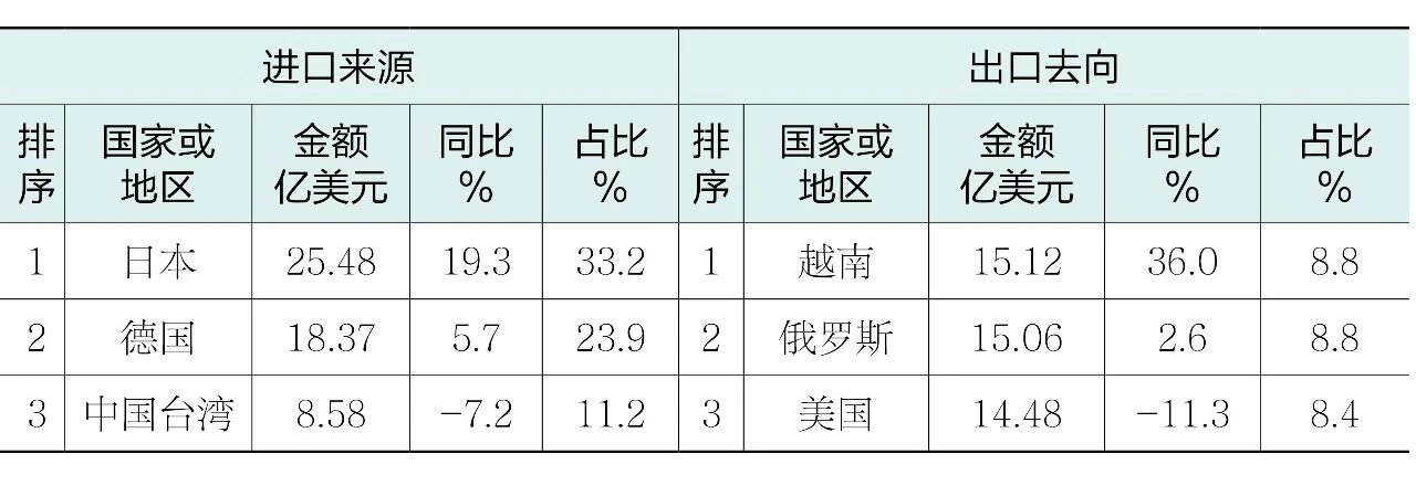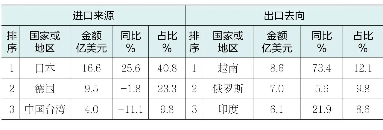 从进口来源前三位的情况看,自日本进口年度内恢复增长,且增幅逐季度扩大;自德国进口年度内恢复增长,但增幅呈收窄趋势;自中国台湾进口仍处于下降区间。从出口去向前三位的情况看,在东南亚地区快速发展带动下,对越南出口持续快速增长;受关税政策不确定性影响,对美国出口年度内持续下降,且降幅呈扩大趋势;对俄罗斯出口年度内小幅增长。