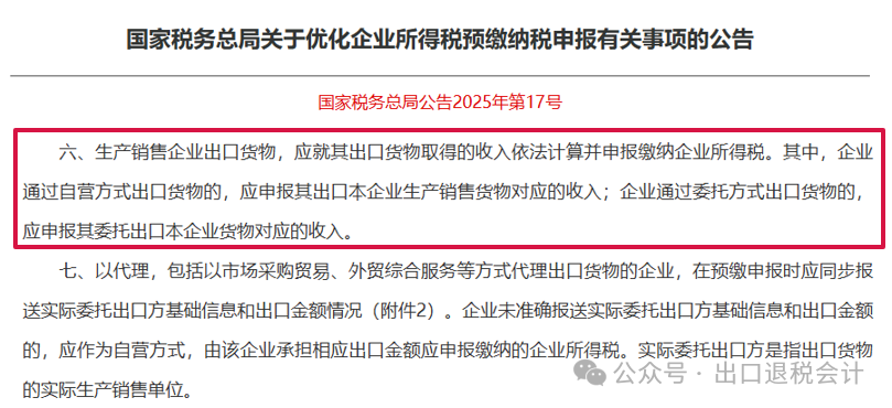 根据国家税务总局公告2025年第17号规定,自2025年10月1日起,企业在办理企业所得税月(季)度预缴纳税申报时,须依法对出口货物取得的收入进行税务处理。