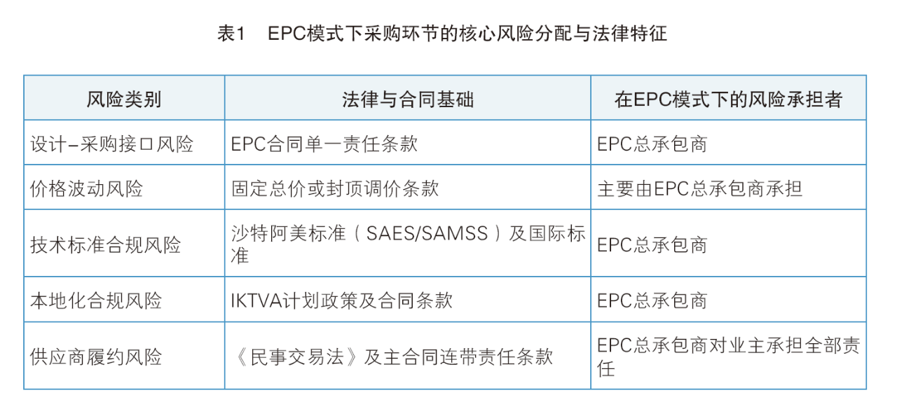 在采购领域,沙特强力推行的IKTVA构成了最核心的合规约束。该政策通过设定明确的本地采购比例(本地内容),强制要求承包商在供应链中纳入沙特本土产品与服务。这在战略上为中国企业提供了市场准入机遇,但在战术层面,却因本地供应链在高技术设备产能、质量管理体系与规模化交付能力方面的不成熟,而引发了成本、进度与质量的次生风险。此外,《反商业隐匿法》严厉打击外资通过本地代理进行实质经营的行为,为采购渠道的合法合规设置了高标准的审查要求。EPC模式下采购环节的核心风险分配与法律特征见表1。