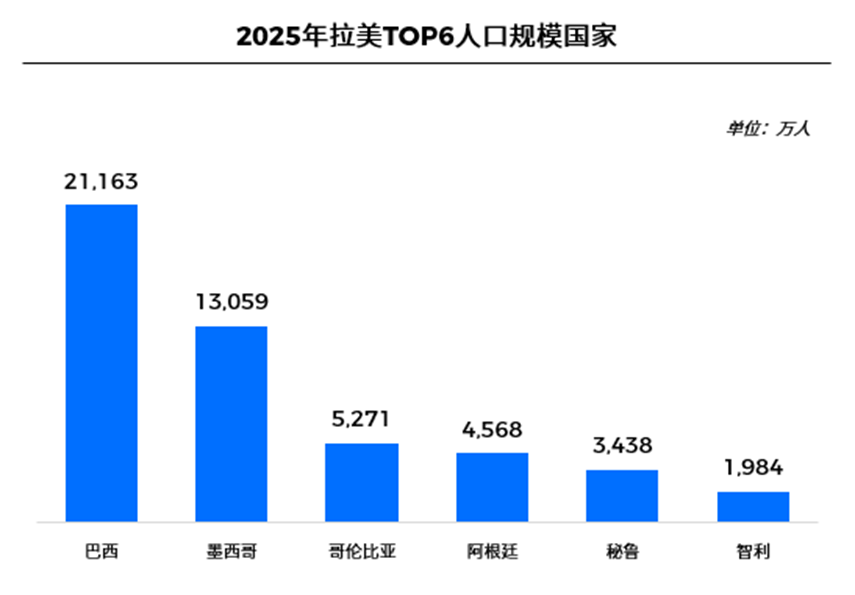 从人口结构看,拉美地区具备显著规模优势。数据显示,拉美地区总人口超过6.6亿,占全球人口的8.1%。其中,巴西人口超过2亿,墨西哥约1.3亿。