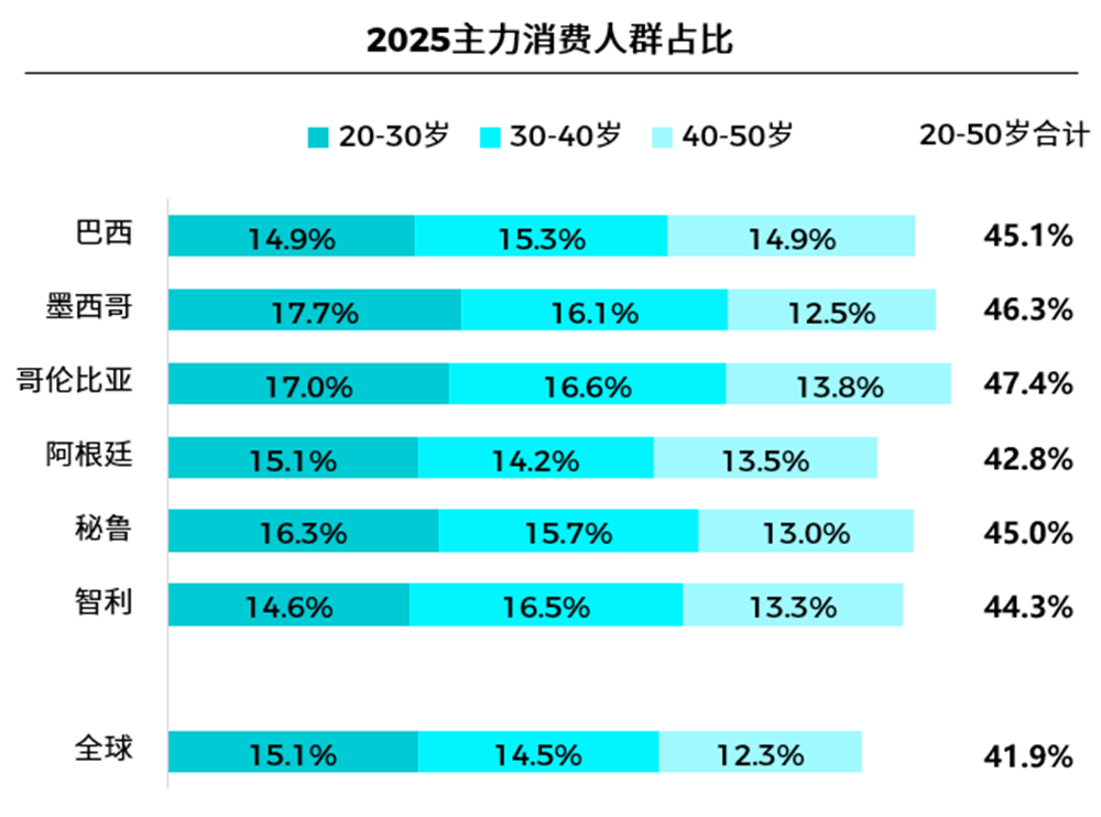 从年龄结构看,拉美人口整体呈现年轻化特征,各国20–50岁主力消费人群占比都超过全球平均水平的41.9%,使区域消费市场保持较高活跃度。