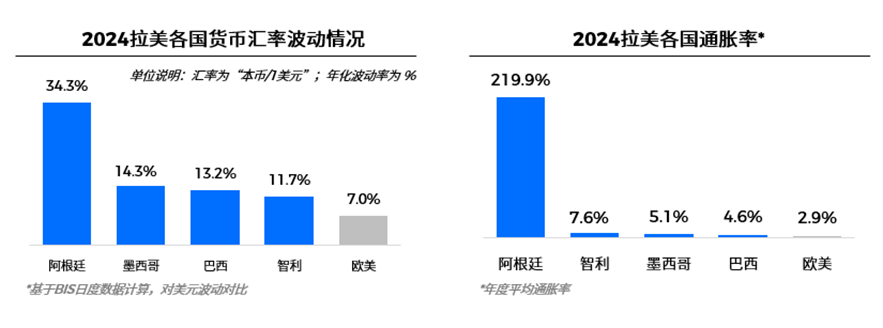 拉美宏观环境的首要挑战在于经济波动性。数据显示,拉美主要国家汇率波动幅度为欧美稳定国家的1.5–2 倍,其中阿根廷高达34.3%。此外,拉美整体通胀水平高于欧美国家,阿根廷尤为突出,其他核心国家相对可控。