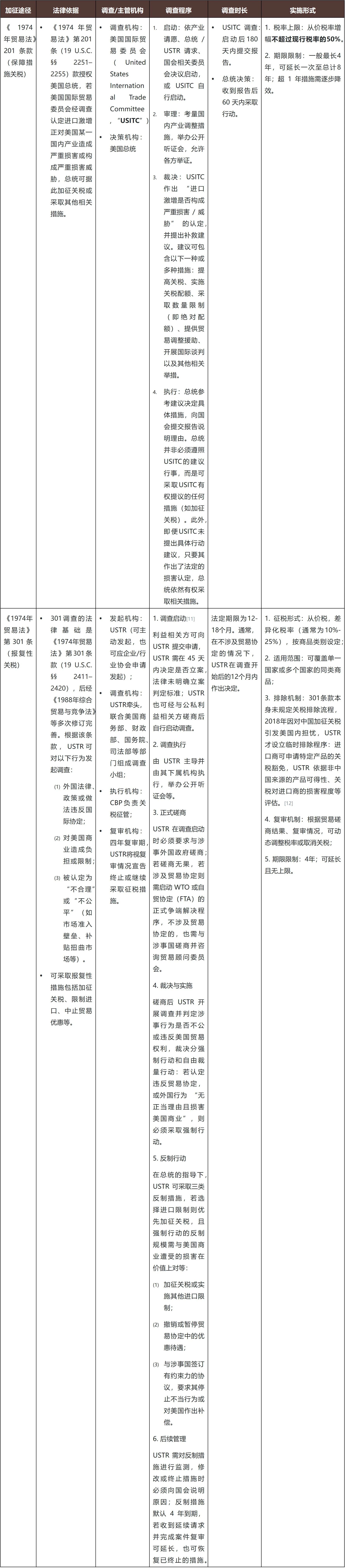 结合本次最高法院裁决及美国现行贸易法律体系,我们理解未来美国政府加征关税的核心途径将聚焦于“具备明确国会授权”的法律条款,除已经适用的《1974年贸易法》第122条外,《1974年贸易法》第201条、第301条、《1962年贸易扩展法》第232条、《1930年贸易法》第338条都可能成为适用的依据,以下以表格形式对这四种加征途径做一归纳,便于读者参阅。