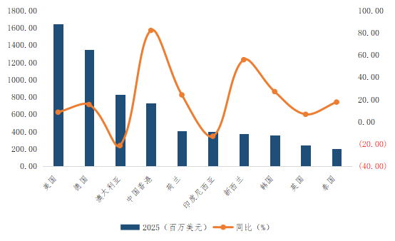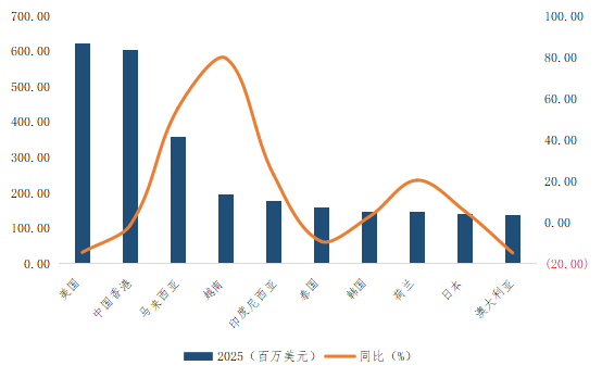 东盟成为增长引擎。2025年中国对东盟十国出口额达12.26亿美元,同比增长28.2%,成为最重要的贸易顺差区域。其中,排名前三位的出口目的地是马来西亚(3.59亿美元)、越南(1.97亿美元)和印度尼西亚(1.79亿美元)。出口至马来西亚和越南的总金额在2025年分别同比大幅增长55.2%和79.5%,使得马、越两国成为中国第三、第四大出口市场。除泰国外,中国对其它东盟国家的出口都较2024年有不同程度的增长。