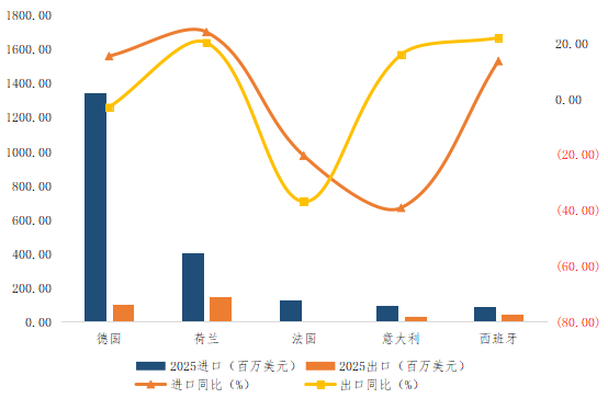 图2:2025年营养保健食品中国与欧盟主要国家进出口情况