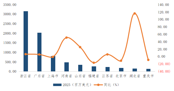 中西部地区正快速崛起为新的增长极。河南省和湖北省同比大幅增长,成为全国增长的重要拉动力量。海南省依托自贸港的政策红利,实现了爆发式增长。全年出口额虽然基数仅为0.56亿美元,但同比增速高达43.9%,政策效应正在加速转化为贸易实绩。