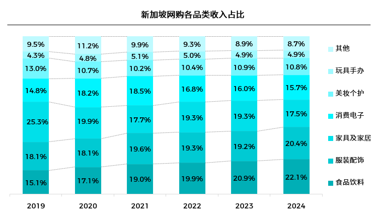 从 2019–2024 年新加坡网购品类收入结构看,整体格局相对稳定,但对中国中小跨境电商的品类选择仍有几方面值得关注: