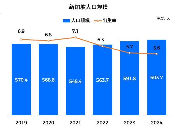 截至2024年,新加坡总人口约为604万,在东南亚地区属于人口规模较小的市场。其人口自然增长缓慢,出生率(6.8‰)远低于世界平均水平(16.1‰)。