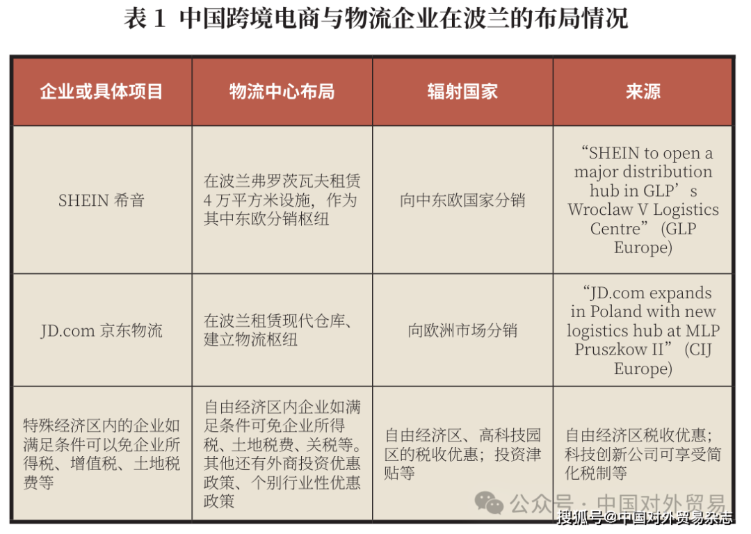 根据波兰发展与技术部的数据,2024年波兰自中国进口额达492亿欧元,对华出口额约36亿欧元。波兰进口的主要商品包括电子产品、工业机械设备以及服装纺织品;出口至中国的产品则以食品(尤其是乳制品)、铜、木材及汽车零部件为主。传统贸易为两国合作奠定了信任与互补基础,但在运距长、关税高、市场反应慢的现实约束下,电商凭借低门槛与高灵活性,正成为推动中波贸易结构优化与产业升级的新动能。大量中国企业选择波兰作为面向欧洲的分拨中心,利用其辐射优势,将货物通过线上渠道销往德国、捷克、斯洛伐克等国。以波兰为节点的“桥头堡式布局”(见表1),正为中波经贸合作注入新的空间与活力。
