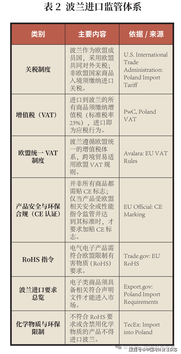 然而,在机遇之外,挑战同样清晰且具体。首先是合规与税务。波兰作为欧盟成员国,进口环节须遵循欧盟统一的关税与增值税(VAT)规则,同时符合产品安全、环保与数据合规要求(表2)。对中国卖家而言,这意味着必须投入额外成本进行合规认证与税务申报。