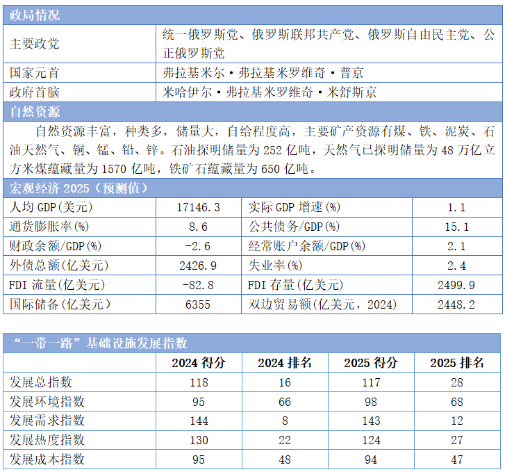 政治环境方面,俄罗斯政局保持高度稳定,普京总统新任期内持续强化国家安全体系,有效应对外部压力,保障了国家战略和政策的连贯性。经济环境方面,在能源出口韧性及内需拉动下,2024年经济表现超预期,实际GDP增长率达4.3%。但西方制裁持续、全球经济增长放缓以及国内劳动力市场短缺等挑战依然存在,2025年俄罗斯经济增速预计放缓至1.1%。营商环境方面,近年来政府推出一系列外资便利化政策,包括简化行政审批、扩大优先发展区税收优惠、强化投资保护立法等,着力提升外商投资的吸引力和便利度。