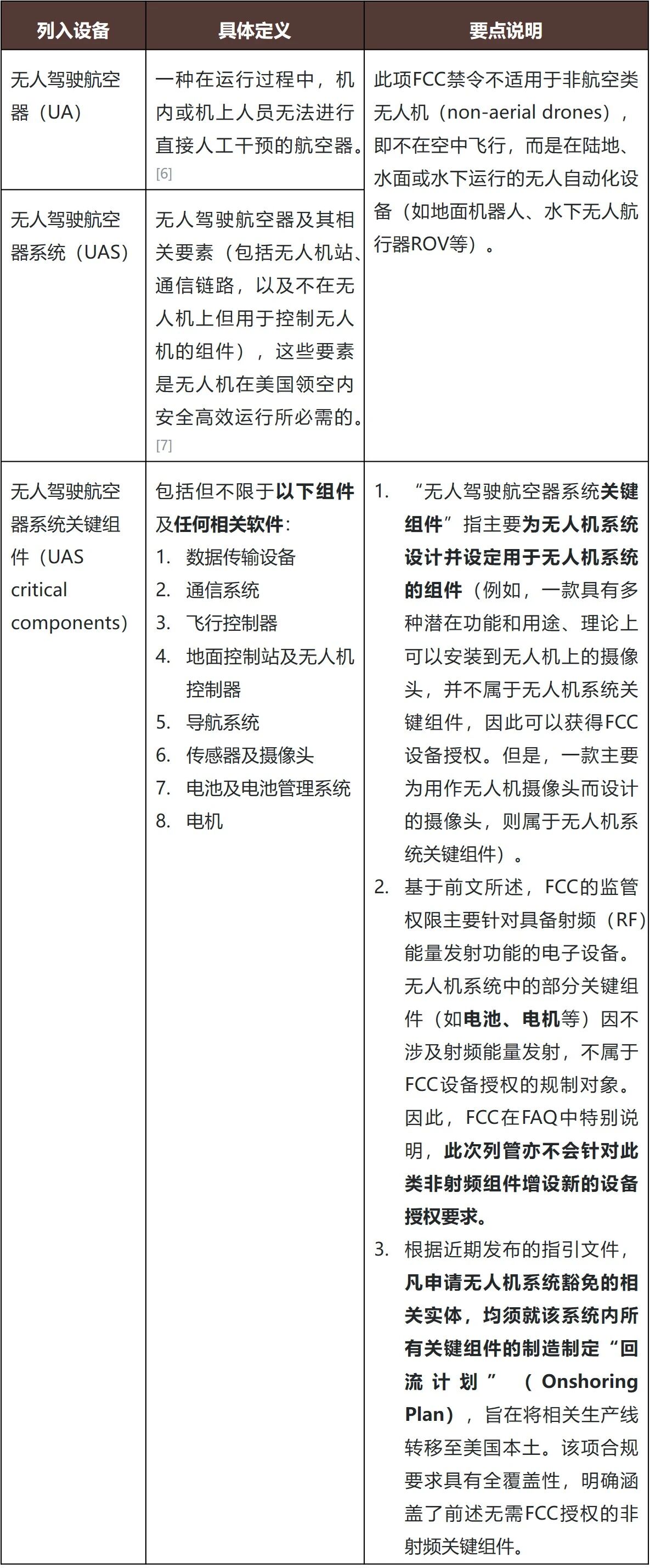 2025年12月22日,美国联邦通信委员会(以下简称“FCC”)基于前一日白宫跨部门协调机构发布的《国家安全认定》,[1]正式宣布将所有外国制造的无人驾驶航空器系统(UAS,以下简称“无人机”)及其关键组件列入“受限清单”(Covered List);除美国国防部(DoW)或国土安全部(DHS)做出特别认定外,FCC将停止为上述受限设备发放新的设备授权(以下简称“FCC新规”)。此举意味着FCC对于非美国产的无人机及其核心组件设置了全面的市场准入限制。