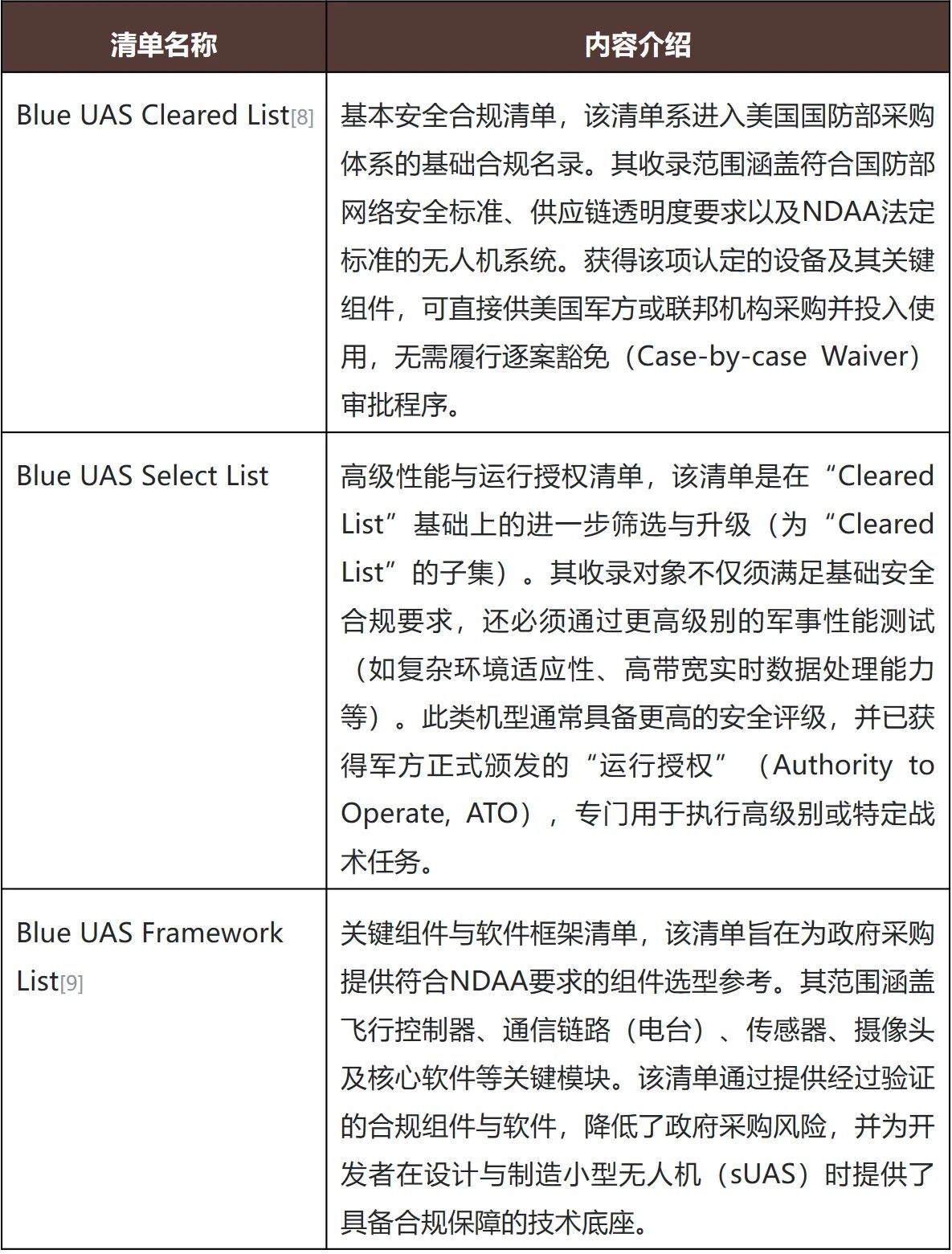 - 列入美国国防合同管理局(Defense Contract Management Agency,以下简称“DCMA”)“蓝标清单”(Blue UAS List)的无人机及关键组件;