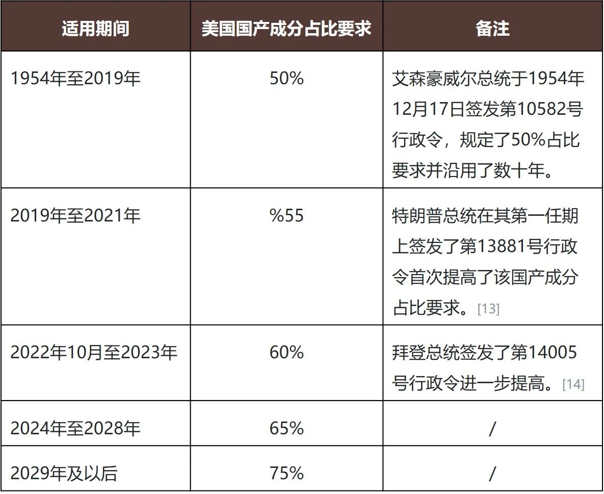 最终产品中所使用的“美国国产组件”成本,在所有组件总成本中的占比必须达到法定最低阈值。该占比要求近年来一直在逐步提高: