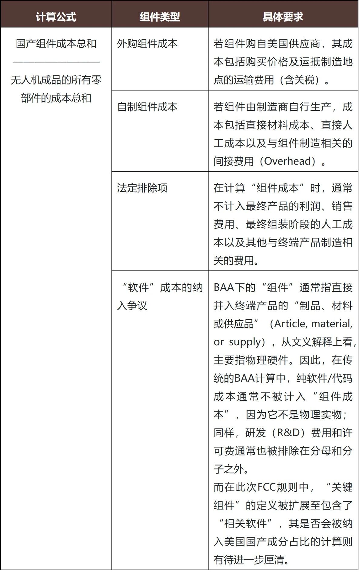 本次监管的核心依据在于产品的“外国制造”属性,并且本次规则在描述风险时均未提及“受关注国家”或“外国对手”,这意味着本次限制性规则对所有非美国本土制造的产品具有普适性。然而FCC新规并未定义何为“外国制造”。在FCC发布的FAQs,判断是否属于“外国生产(produced in a foreign country)”的标准与生产无人机或关键组件的企业国籍无关,仅取决于生产工厂位置是否位于美国境内。这意味美国公司在海外工厂制造的无人机和关键组件似乎也将受到限制。相反,在无特殊例外的情况下,外国公司在美国境内制造的无人机和关键组件则不受限制。然而,目前的规定尚未明确从初步设计到最终组装的生产过程中,究竟哪些环节必须在美国境内完成方可获得“美国制造”的认定,我们认为可以参考《购买美国货法案》(Buy American Act, 以下简称“BAA”)下关于认定“国产终端产品”(Domestic End Products)规则中的“美国制造”标准。这显然也体现了FCC新规实际想实现的真实意图,即通过政策壁垒和引导的方式,诱使美国无人机制造商完成供应链的本土回流,以及迫使重视美国市场的外国无人机制造商进行美国本土供应链建设,最终重塑美国在无人机制造业领域的竞争优势。