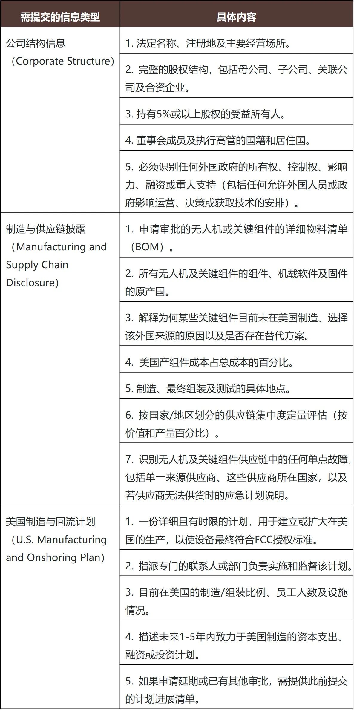 申请人须提交下表所列的三大类信息,并由经授权的公司负责人对所有信息的完整性与准确性进行确认。所有申请材料应通过电子方式发送至指定联系邮箱:drones@fcc.gov;