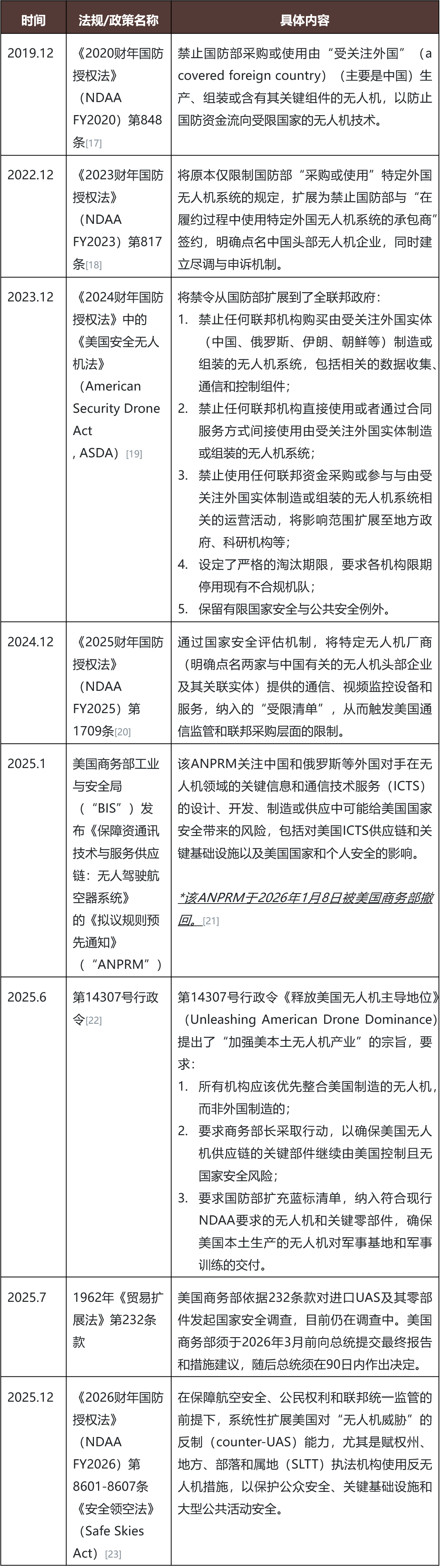 随着美国近年来对无人机的监管呈现明显的体系化趋势,针对监管对象的中国无人机制造商,其所面临的监管逻辑也已从最初的“政府禁买”向“全美市场准入限制”升级。与此同时,在本届美国政府任上,监管理念从单纯的“防范国家安全风险”进一步叠加了“扶持美国本土制造业”的双轨并行策略。我们在此梳理了本次FCC新规前的美国针对无人机的监管历程,能够清晰的反映这一趋势变化: